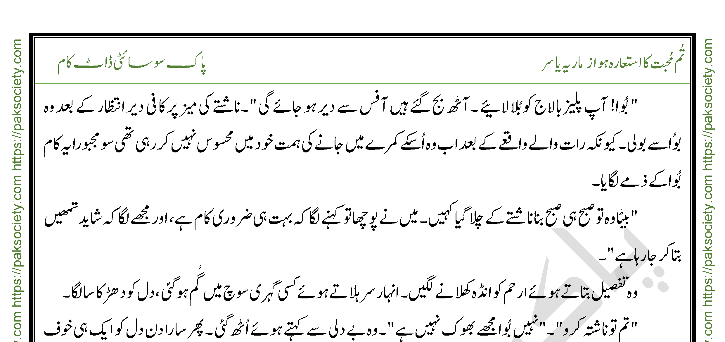 Maria Yasir is not a new writer, She writes for different digests and this is her First Online novel for Paksociety Readers, Paksociety is proud to publish her new Novel “Tum Muhabbat Ka Istara Ho” online. This is story of a girl who faces difficulties in her life after the death of his father, and about her struggle For her family, about the love of her life, This is story of two brothers , both fall in love with same girl, This is story of sacrifice and brotherhood, this is story of pain and happiness. We hope this novel will quench your thirst of reading, Currently it is available for online reading only but we will add downloading link after completion of novel.